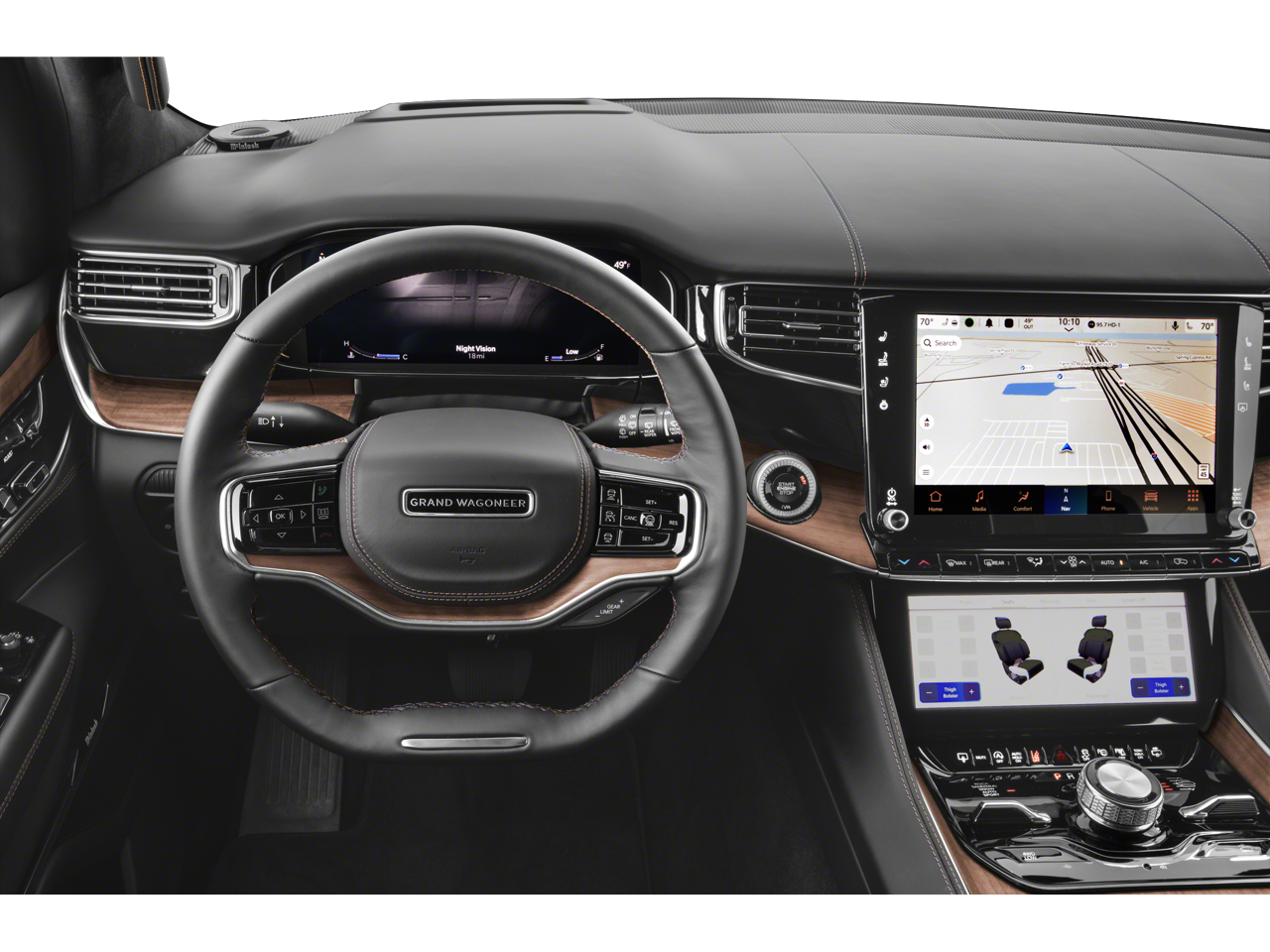 Burlington CJDR is proud to offer this good-looking 2025 Jeep Grand Wagoneer an absolutely wonderful-looking SUV with the following Features: HD Trailer Tow Package (Heavy-Duty Engine Cooling, Removable Rear Tow Hook, Trailer Brake Control, and Trailer Hitch Zoom), MOPAR Interior Protection Package (All-Season Floor Mats and Cargo Tray), Obsidian Appearance Package, Quick Order Package 28T Obsidian (Black Exterior Accents, Black Interior Accents, Black Roof, Gloss Black Upper & Lower DLO Molding, and Wheels: 22 x 9.0 Polished Painted Pockets), Two Tone Paint Group, 3.92 Rear Axle Ratio, 3rd row seats: bench, 4-Wheel Disc Brakes, ABS brakes, Adjustable pedals, Air Conditioning, Alloy wheels, AM/FM radio: SiriusXM with 360L, Anti-whiplash front head restraints, Apple CarPlay/Android Auto, Audio memory, Auto High-beam Headlights, Auto-dimming door mirrors, Auto-dimming Rear-View mirror, Auto-leveling suspension, Automatic temperature control, Brake assist, Bumpers: body-color, Compass, Delay-off headlights, Driver door bin, Driver vanity mirror, Driver's Seat Mounted Armrest, Dual front impact airbags, Dual front side impact airbags, Electronic Stability Control, Emergency communication system: Jeep Connect, Four wheel independent suspension, Front anti-roll bar, Front Bucket Seats, Front Center Armrest w/Storage, Front dual zone A/C, Front fog lights, Front reading lights, Fully automatic headlights, Garage door transmitter, Genuine wood console insert, Genuine wood dashboard insert, Genuine wood door panel insert, Hands-Free Active Driving Assist System, Heads-Up Display, Heated door mirrors, Heated front seats, Heated rear seats, Heated steering wheel, Illuminated entry, Knee airbag, Leather steering wheel, Low tire pressure warning, Memory seat, Navigation System, Night vision lights, Normal Duty Suspension, Occupant sensing airbag, Outside temperature display, Overhead airbag, Overhead console, Panic alarm, Passenger door bin, Passenger seat mounted armrest, Passenger vanity mirror, Pedal memory, Power adjustable front head restraints, Power door mirrors, Power driver seat, Power Liftgate, Power moonroof, Power passenger seat, Power steering, Power windows, Premium Leather Trimmed Bucket Seats, Radio data system, Radio: Uconnect 5 Nav w/12.0 Display, Rain sensing wipers, Rear air conditioning, Rear anti-roll bar, Rear dual zone A/C, Rear reading lights, Rear seat center armrest, Rear window defroster, Rear window wiper, Reclining 3rd row seat, Remote keyless entry, Roof rack, Security system, Speed control, Speed-sensing steering, Speed-Sensitive Wipers, Split folding rear seat, Steering wheel memory, Steering wheel mounted audio controls, Tachometer, Telescoping steering wheel, Tilt steering wheel, Traction control, Trip computer, Turn signal indicator mirrors, Variably intermittent wipers, Ventilated front seats, Ventilated rear seats, Voltmeter, and Wheels: 22 x 9.0 Painted Aluminum.